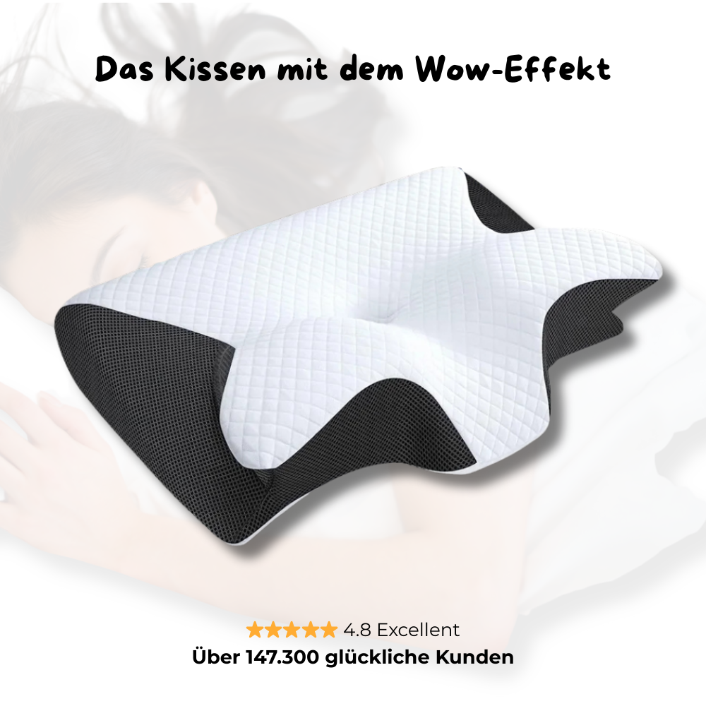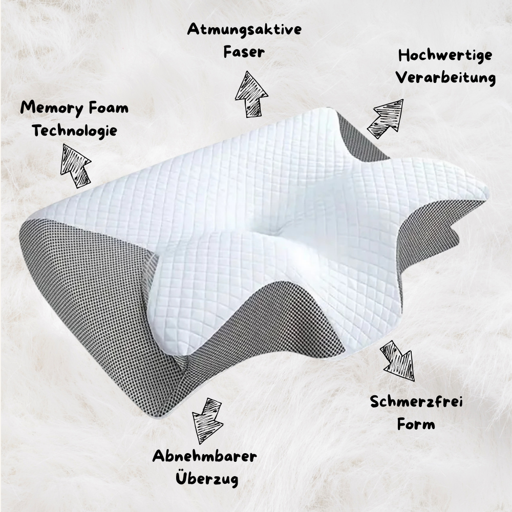 Die einzigartige Schmetterlingsform stützt Kopf, Nacken und Schultern optimal – egal, ob du auf der Seite, dem Rücken oder dem Bauch schläfst. Der hochwertige Memory Foam passt sich deiner Kopfform an und sorgt für gleichmäßige Druckverteilung.